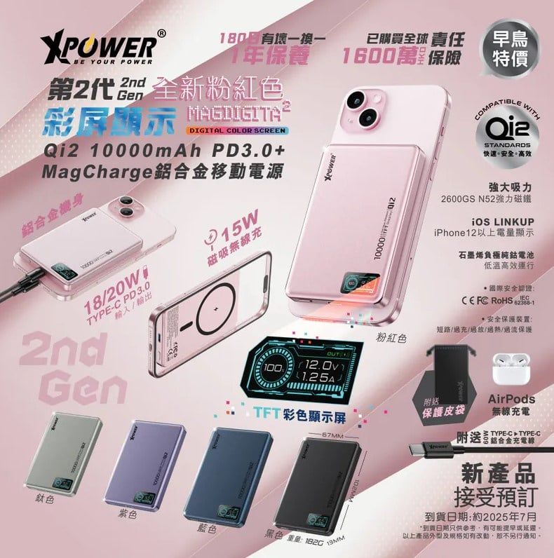 •兼容Qi2技術,可為iPhone 12-17系列及相容的Android 電話提供最大15W磁吸無線快充