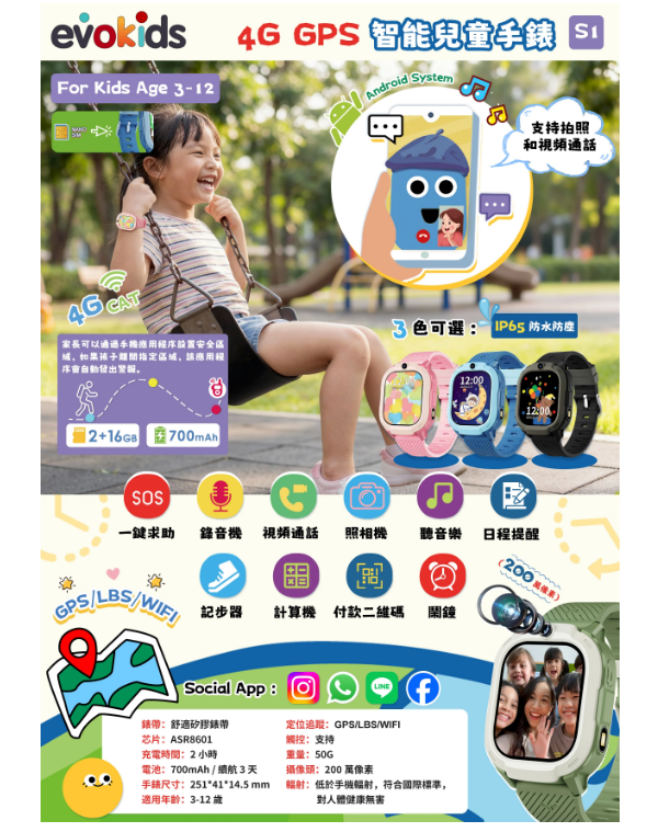 Evokids Smart Watch S1 專為香港家庭而設,集 GPS 精準定位、4G 通話、WhatsApp 視訊及智能管控模式於一身,是日常返學及外出活動的理想守護裝置。